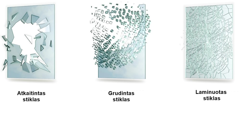 Stogams dažnai rekomenduojamas laminuotas grūdintas stiklas (pvz., 4+4 mm) – jei sudūžta, šukės lieka prikibusios prie plėvelės ir nenukrenta žemyn.