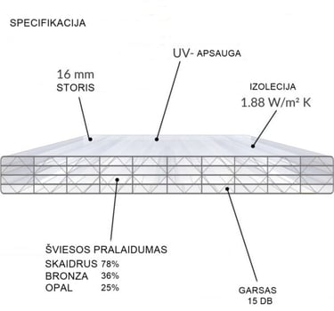 Aukšta šilumos izoliacija: 16 mm polikarbonato plokštės turi kelias oro kameras, kurios efektyviai sulaiko šilumą.
