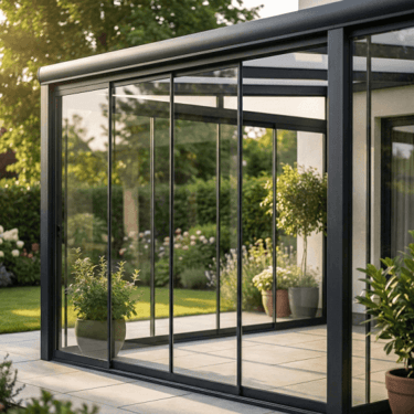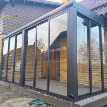 Stumdoma berėmė arba rėminė aliuminio profilio sistema stiklinimui. Tvirta ir ilgaamžė aliuminio konstrukcija su bėgeliais. Greitas, patogus ir lengvas aliuminės stoginės, medinės stoginės šonų stiklinimo būdas.